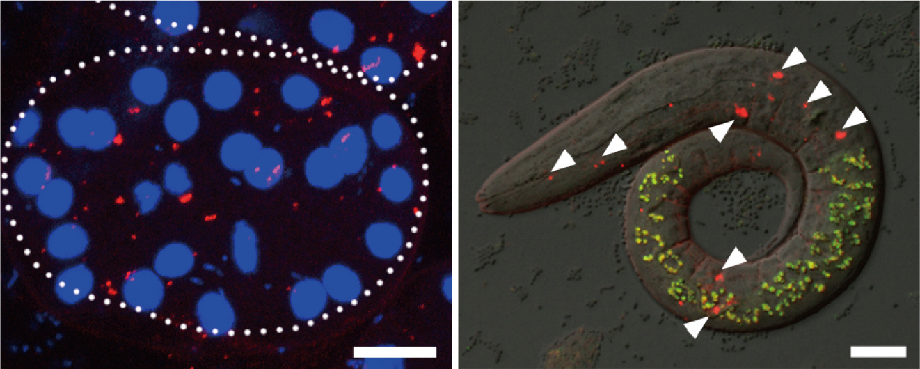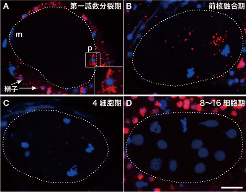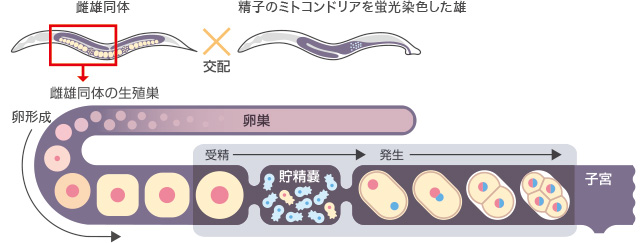 私たちは体が透明で受精卵の解析が容易な線虫C. elegansを使って、精子ミトコンドリアの受精後の運命を調べた。線虫は基本的に雌雄同体で自家受精するが、0.1パーセントの割合で出現する雄個体との交配も可能である。そこで雄の精子ミトコンドリアだけを蛍光試薬で標識し、受精卵における挙動を観察した(図2)。