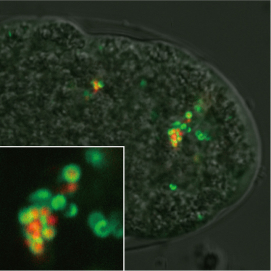 (写真2) 父性ミトコンドリア(赤)のオートファゴソームへの取り込み