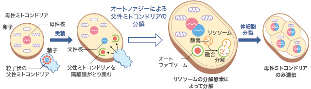 受精後、卵子に侵入した父性ミトコンドリアは、膜に囲まれ、オートファゴソームに隔離されて、リソソームの酵素の分解を受ける。