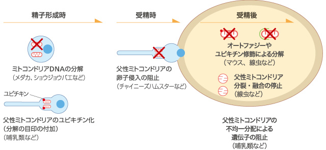 ゲノムDNAの分解、ミトコンドリアの分解など複数の方法を使い、父性ミトコンドリアゲノムが次世代に伝わらないようしくまれている。